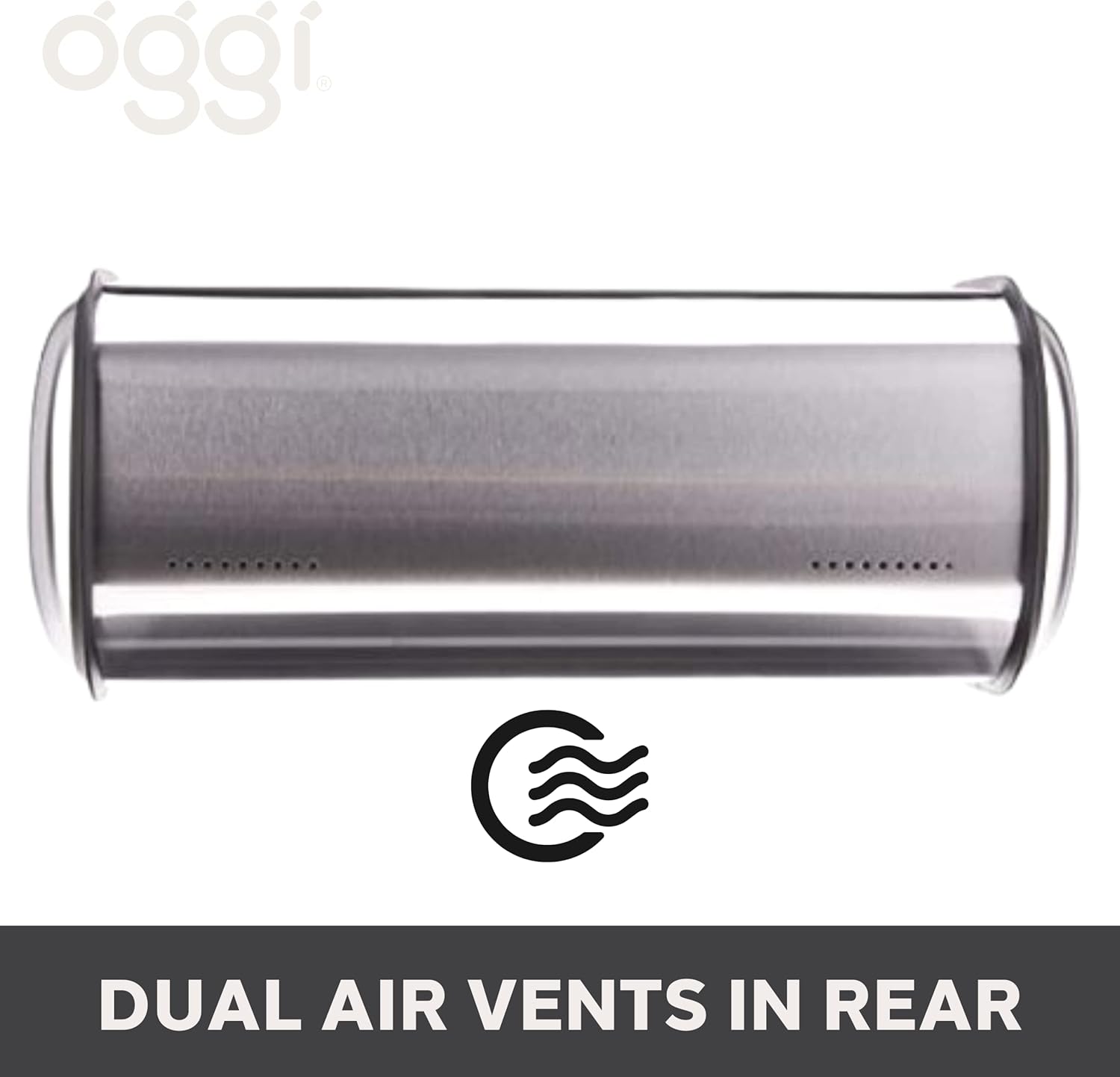 Keep your bread and other freshly baked goods fresh and organized with the Oggi Stainless Steel Roll Top Bread Box. This sleek and modern bread box is designed to fit multiple large loaves of bread, as well as cookies, bagels, muffins, and more. The stainless steel construction is not only durable and long-lasting, but also adds a touch of elegance to your kitchen countertop. The roll top lid ensures easy access to your baked goods while keeping them protected from air and moisture. Say goodbye to stale bread and hello to deliciously fresh treats with the Oggi Stainless Steel Roll Top Bread Box.